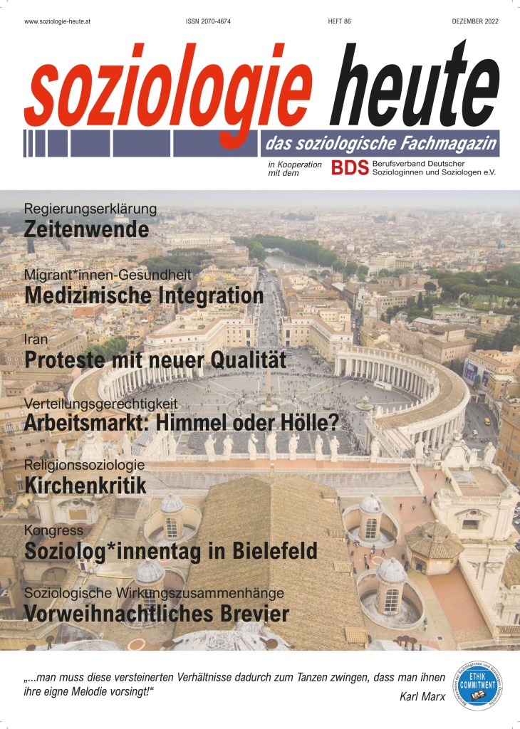 soziologie heute will auch in dieser Ausgabe wieder Meinungen, Forschungsergebnisse und Denkanstöße bringen. So etwa bezieht sich die Soziologin Wilma Ruth Albrecht in ihrem Beitrag auf die Regierungserklärung des deutschen Bundeskanzler Olaf Scholz und analysiert die von Scholz vorgelegten fünf Handlungsziele mit Blick auf die weltweiten Profiteure und Verlierer.