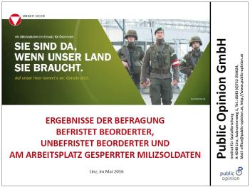 Der vorliegende Bericht beinhaltet die Ergebnisse der im Auftrag des Bundesministeriums für Landesverteidigung und Sport vom Linzer Sozialforschungsinstitut Public Opinion GmbH im April 2016 durchgeführten Onlinebefragung.